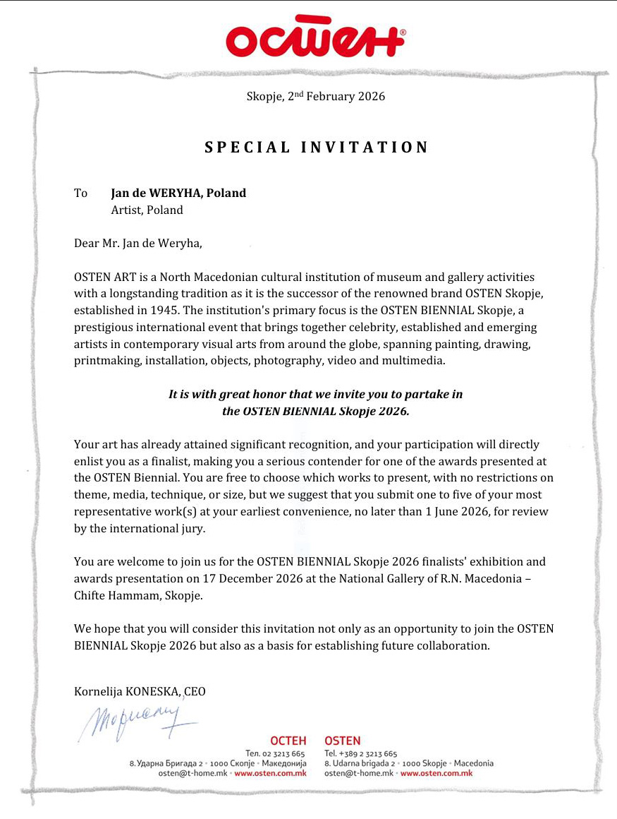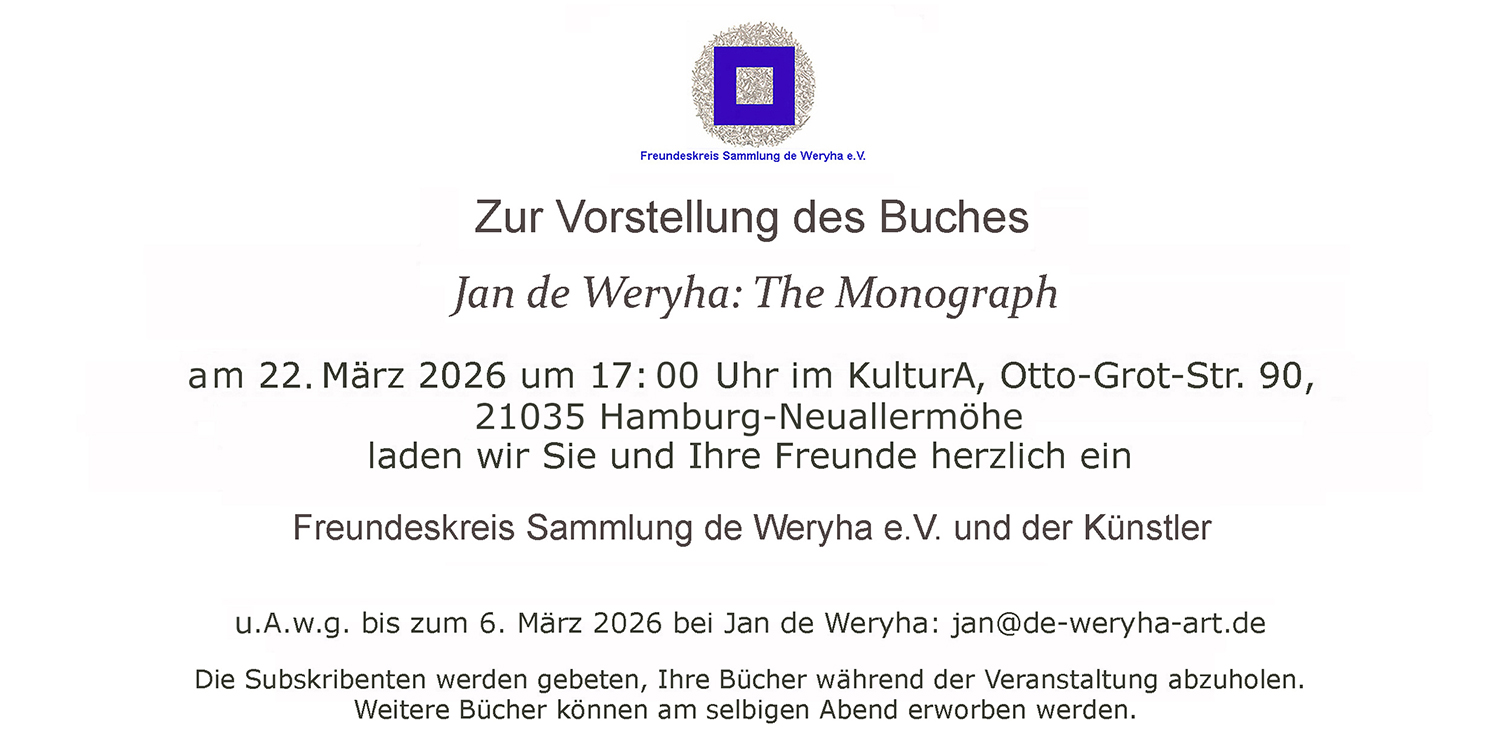 Zusammen mit dem Freundeskreis Sammlung de Weryha e. V. und dem Kucharski-Verlag bereiten wir aus Anlass meines 75. Geburtstages eine 500-Seiten Monografie vor, die noch dieses Jahr erscheinen soll. Titel: Jan de Weryha THE MONOGRAPH